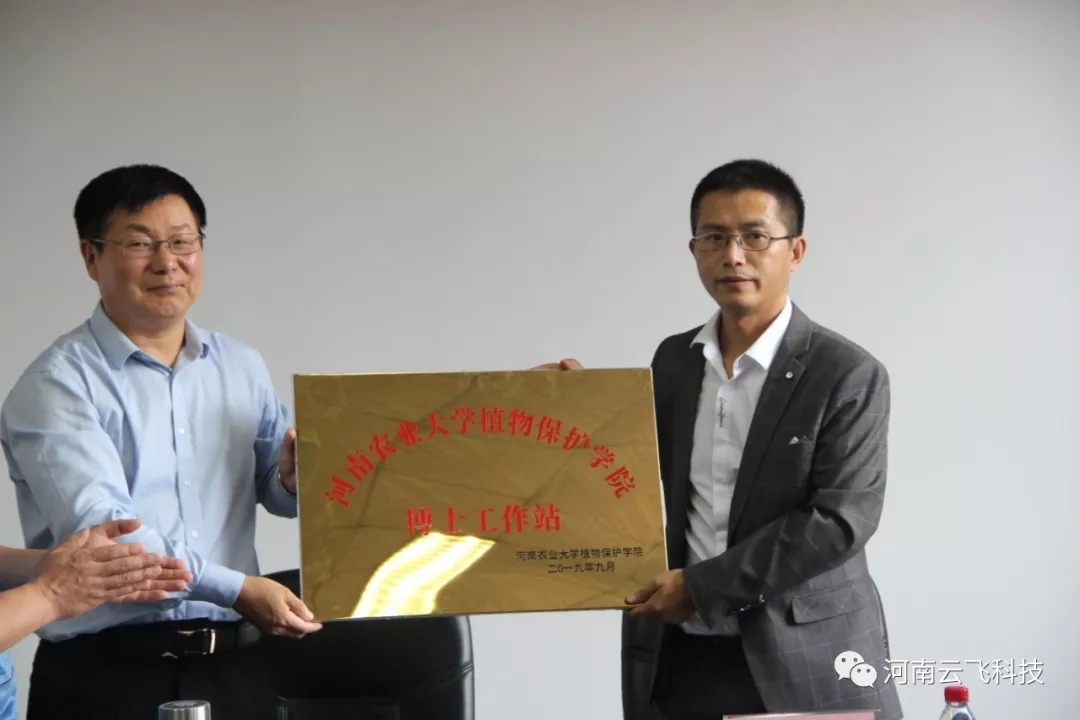 接下來(lái)進(jìn)行正式簽約儀式和授牌,河南云飛總經(jīng)理周?chē)?guó)濤和河南農(nóng)大植保學(xué)院院長(zhǎng)李洪連簽署了院企合作協(xié)議,并接受河南農(nóng)大植保學(xué)院“河南農(nóng)業(yè)大學(xué)植物保護(hù)學(xué)院實(shí)習(xí)教育基地”和“河南農(nóng)業(yè)大學(xué)植物保護(hù)學(xué)院博士工作站”的授牌。