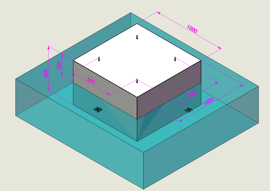 3、按下圖澆筑混凝土地基,外形尺寸(長(zhǎng)X寬X高)=100CM*100CM*60CM,露出地面高度30CM,地基預(yù)埋角鐵框架,框架露出混凝土地基高度為300mm,需保持角鐵框架垂直,不能有歪斜情況。(若角鐵架子沒有預(yù)埋,可按照?qǐng)D紙孔距打孔,預(yù)埋四顆M12*120mm鐵膨脹螺栓,螺栓露出地基高度30mm左右,中心距595X595mm,需保持螺栓垂直,不能有歪斜情況)。